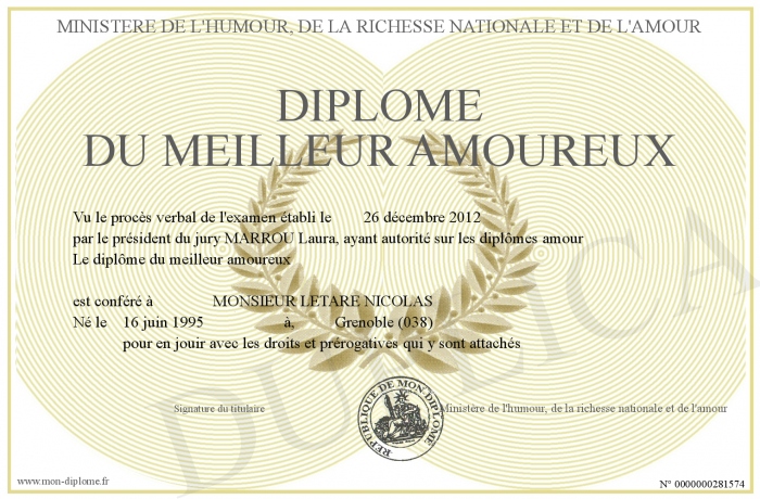 Envoyez par email votre Diplôme du meilleur amoureux personalisé
