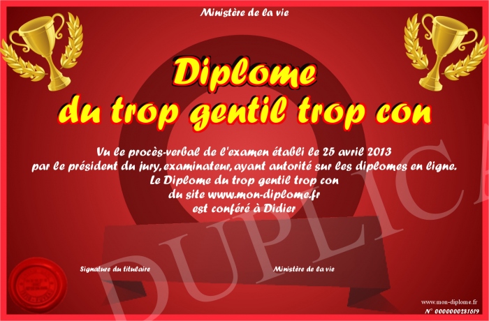 Envoyez par email votre Diplôme du trop gentil trop con personalisé