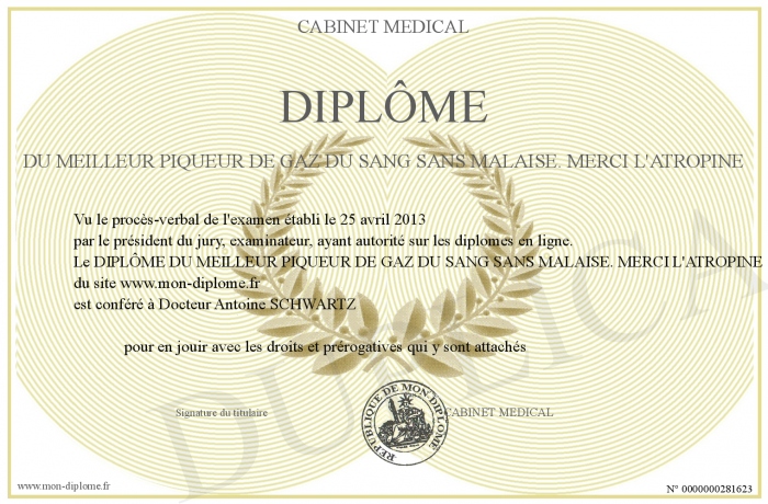 Envoyez par email votre DIPLÔME DU MEILLEUR PIQUEUR DE GAZ DU SANG SANS MALAISE. MERCI L'ATROPINE personalisé