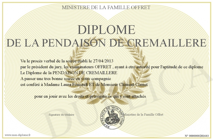 Envoyez par email votre Diplôme de la PENDAISON DE CREMAILLERE personalisé