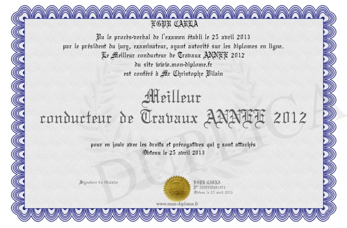 Envoyez par email votre Meilleur conducteur de Travaux ANNEE 2012 personalisé