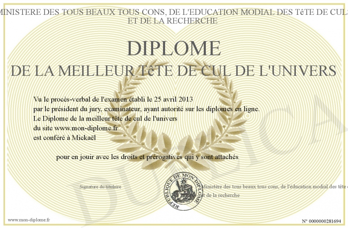 Envoyez par email votre Diplôme de la meilleur tête de cul de l'univers personalisé