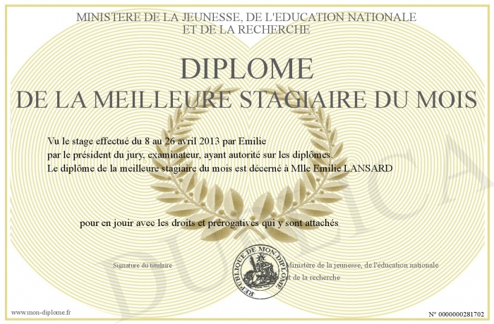 Envoyez par email votre Diplôme de la meilleure stagiaire du mois personalisé