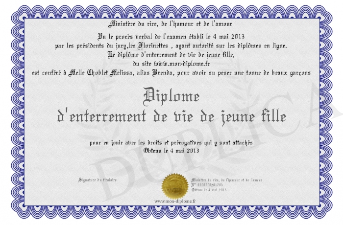 Envoyez par email votre Diplome d'enterrement de vie de jeune fille personalisé