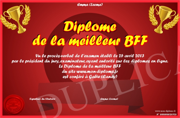 Envoyez par email votre Diplôme de la meilleur BFF personalisé