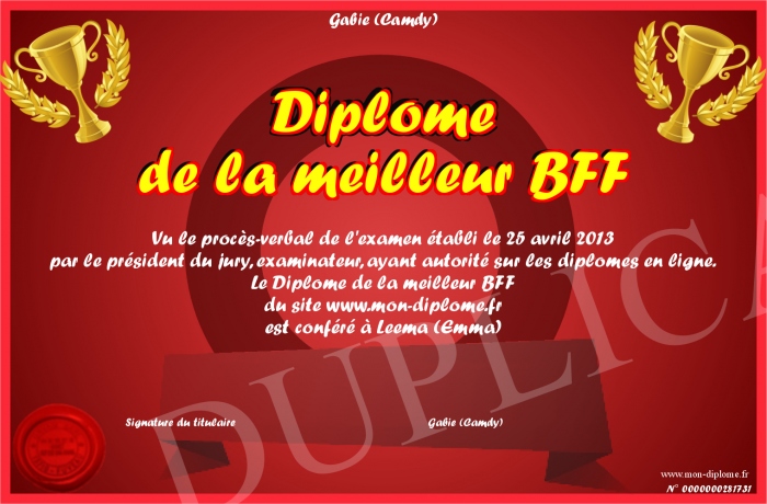Envoyez par email votre Diplôme de la meilleur BFF personalisé
