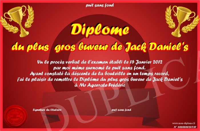 Envoyez par email votre Diplôme du plus gros buveur de Jack Daniel's personalisé