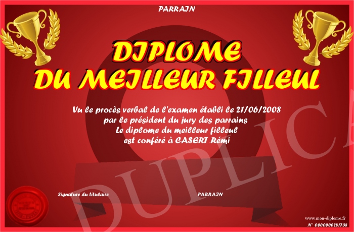 Envoyez par email votre DIPLOME DU MEILLEUR FILLEUL personalisé