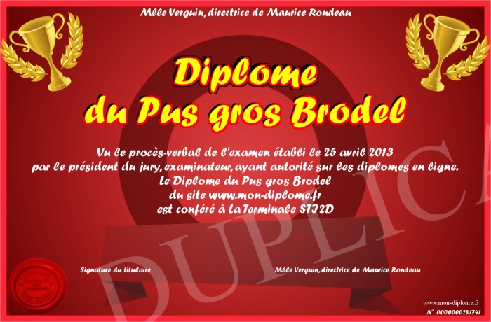 Envoyez par email votre Diplôme du Pus gros Brodel personalisé