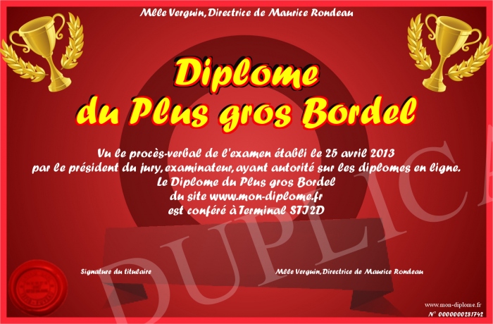 Envoyez par email votre Diplôme du Plus gros Bordel personalisé