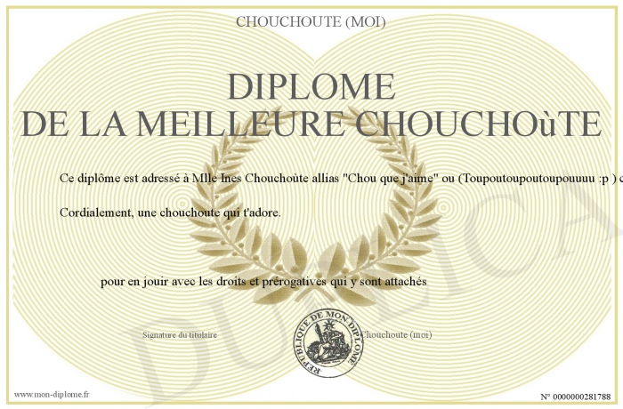 Envoyez par email votre Diplôme de la meilleure Chouchoùte personalisé