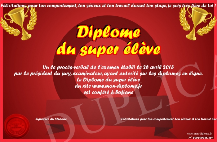 envoyé par le Félicitations pour ton comportement, ton sérieux et ton travail durant ton stage, je suis très fière de toi ! !