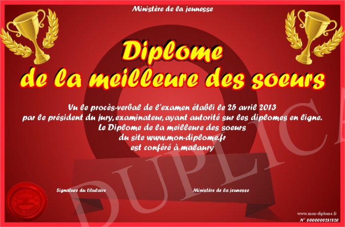 Envoyez par email votre Diplôme de la meilleure des soeurs personalisé