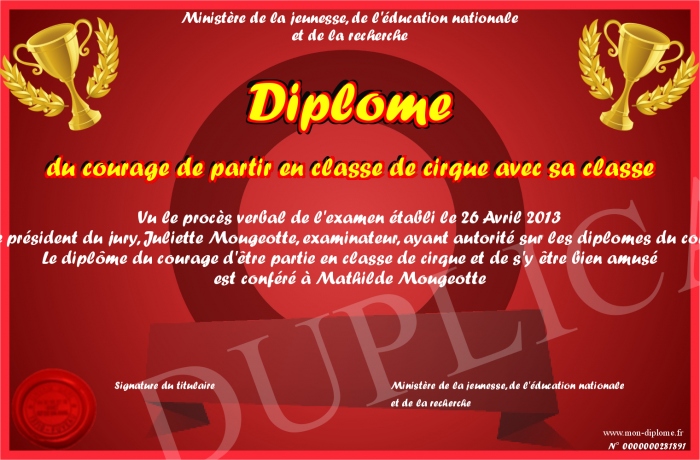 Envoyez par email votre Diplôme du courage de partir en classe de cirque avec sa classe personalisé