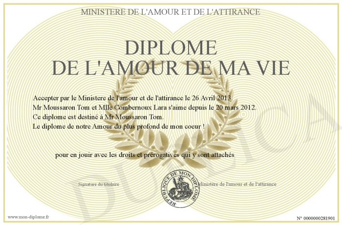 Envoyez par email votre Diplome de l'amour de ma vie personalisé