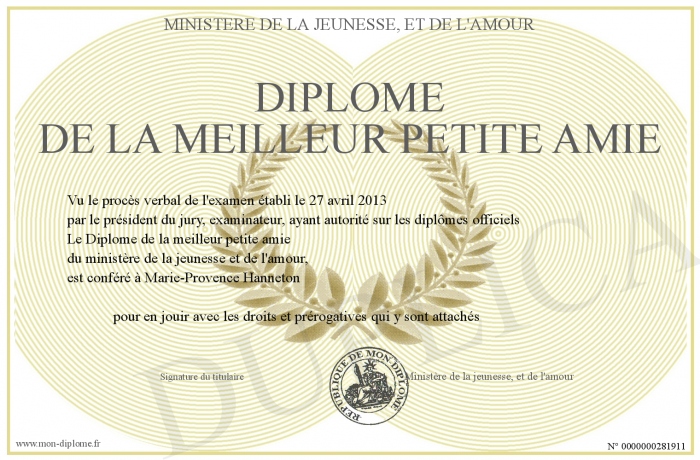 Envoyez par email votre Diplôme de la meilleur petite amie personalisé