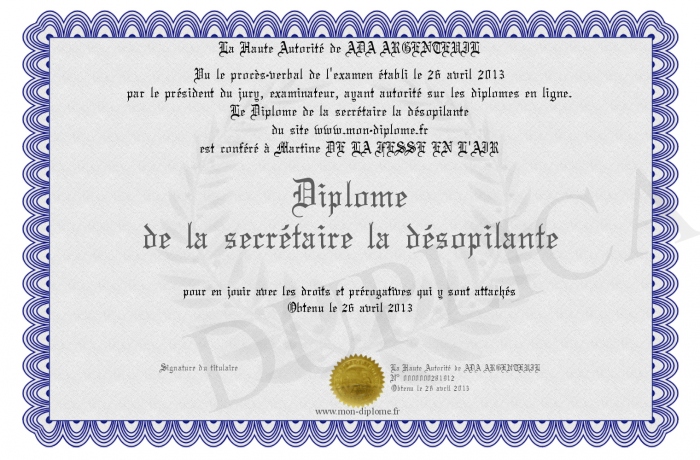 Envoyez par email votre Diplôme de la secrétaire la désopilante personalisé