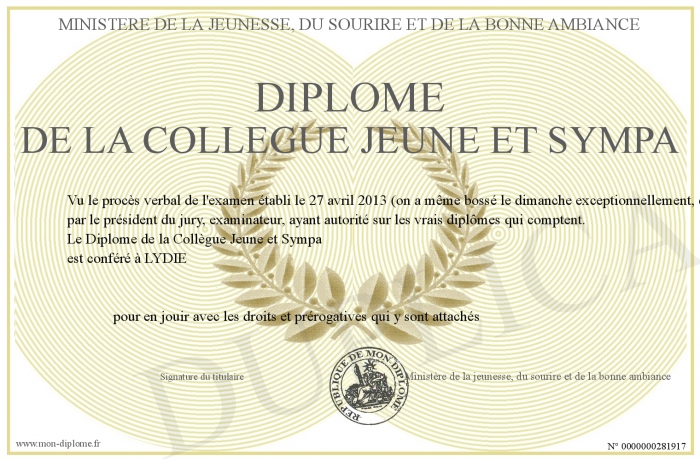 Envoyez par email votre Diplôme de la Collègue Jeune et Sympa personalisé