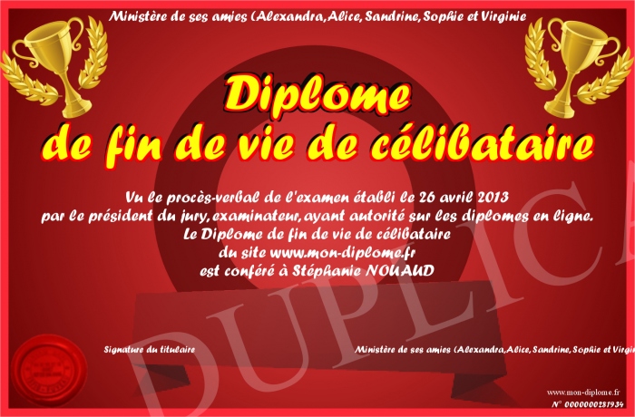 Envoyez par email votre Diplôme de fin de vie de célibataire personalisé