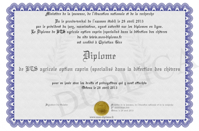 Envoyez par email votre Diplome de BTS agricole option caprin (specialisé dans la défection des chèvres personalisé