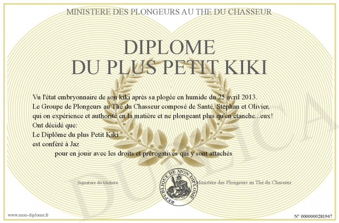 Envoyez par email votre Diplôme du plus petit kiki personalisé