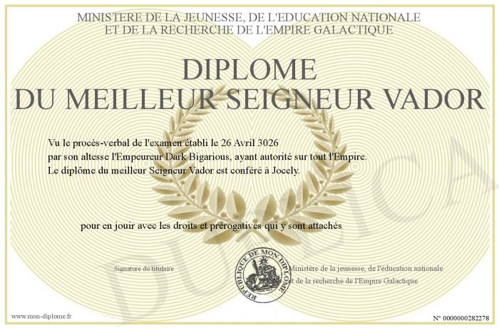 Envoyez par email votre Diplôme du meilleur Seigneur Vador personalisé
