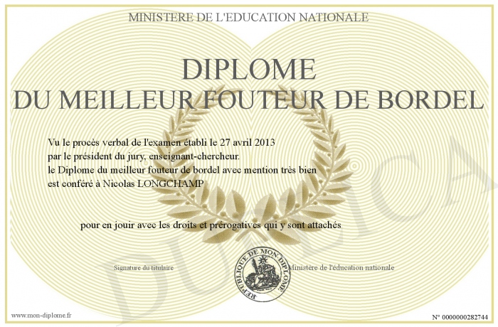 Envoyez par email votre Diplôme du meilleur fouteur de bordel personalisé