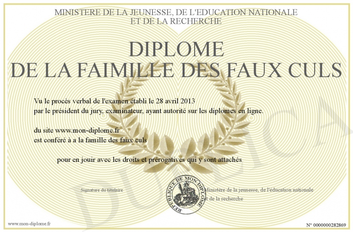 Envoyez par email votre Diplôme de la faimille des faux culs personalisé