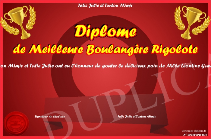 Envoyez par email votre Diplôme de Meilleure Boulangère Rigolote personalisé