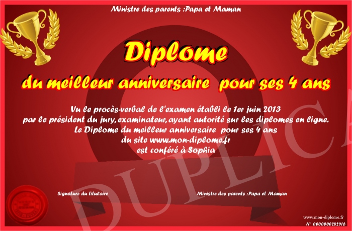Envoyez par email votre Diplome du meilleur anniversaire pour ses 4 ans personalisé
