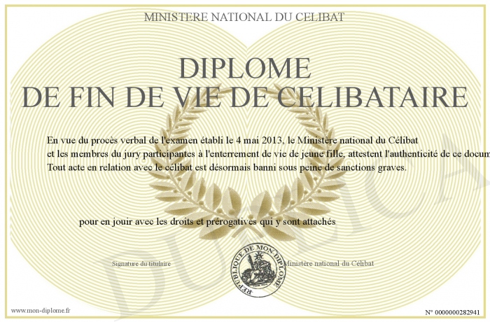 Envoyez par email votre Diplôme de fin de vie de célibataire personalisé