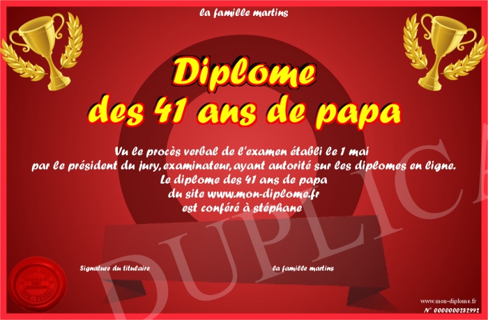 Envoyez par email votre Diplôme des 41 ans de papa personalisé