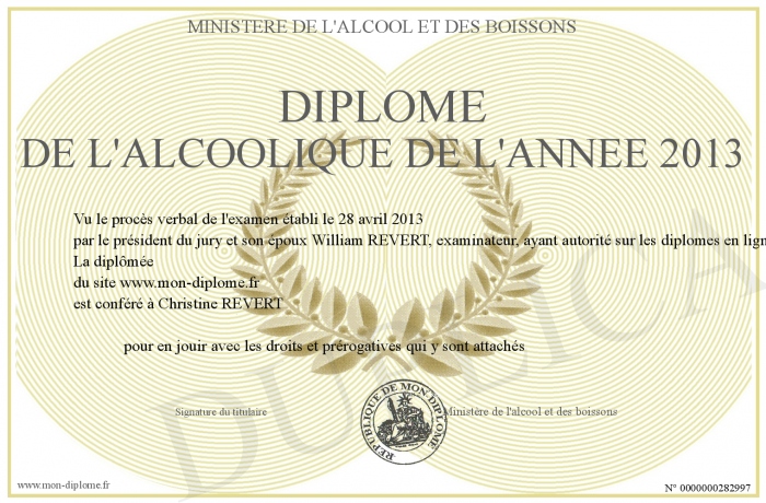Envoyez par email votre Diplome de l'alcoolique de l'année 2013 personalisé