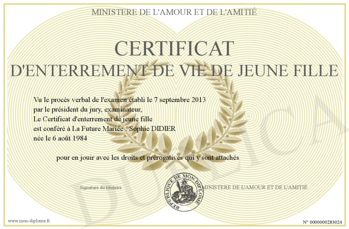 Envoyez par email votre CERTIFICAT d'Enterrement de Vie de Jeune Fille personalisé
