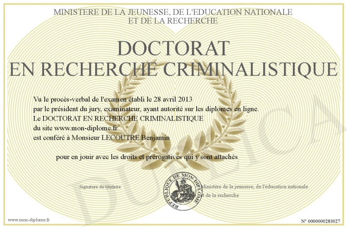 Envoyez par email votre DOCTORAT EN RECHERCHE CRIMINALISTIQUE personalisé