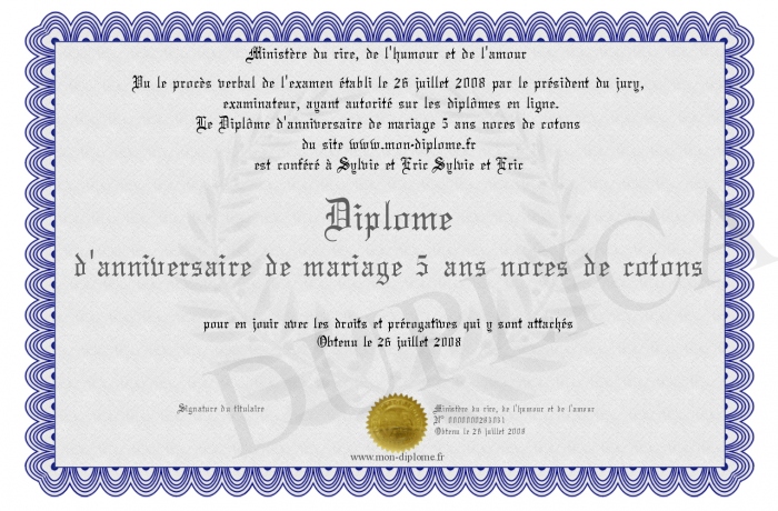 Envoyez par email votre Diplome d'anniversaire de mariage 5 ans noces de cotons personalisé
