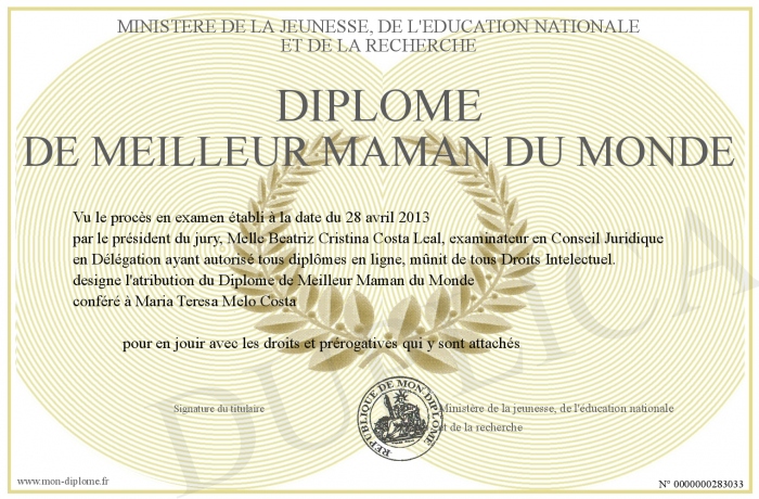 Envoyez par email votre Diplôme de Meilleur Maman du Monde personalisé