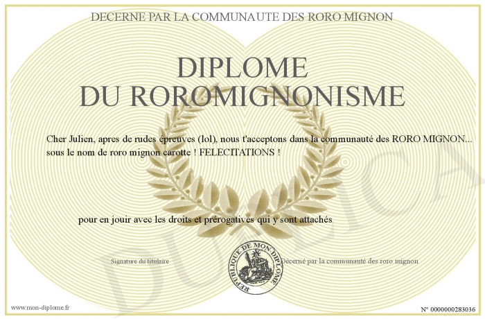 Envoyez par email votre Diplôme du roromignonisme personalisé