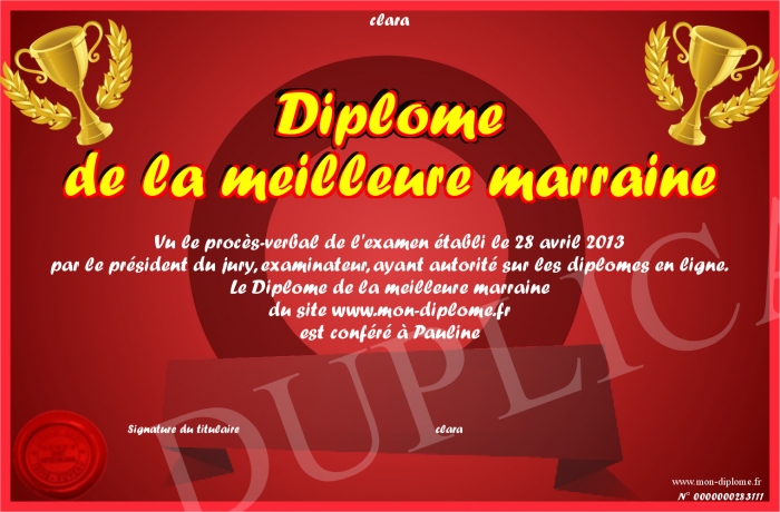 Envoyez par email votre Diplôme de la meilleure marraine personalisé