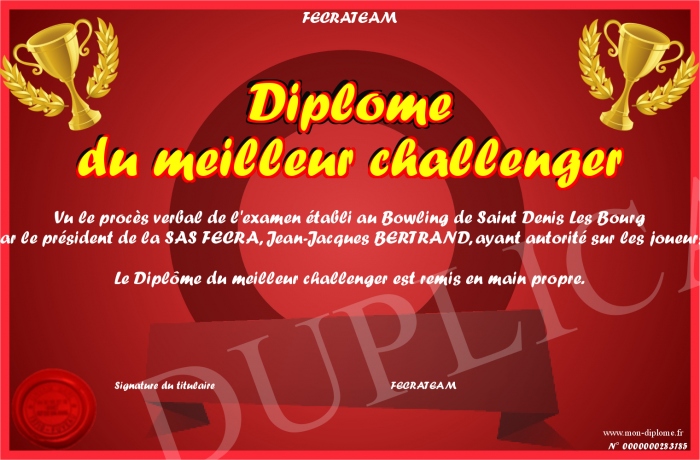 Envoyez par email votre Diplôme du meilleur challenger personalisé