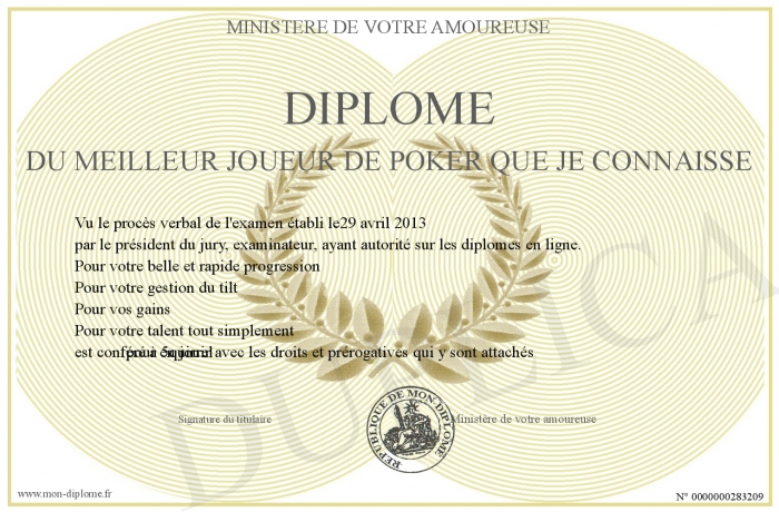 Envoyez par email votre Diplôme du meilleur joueur de poker que je connaisse personalisé