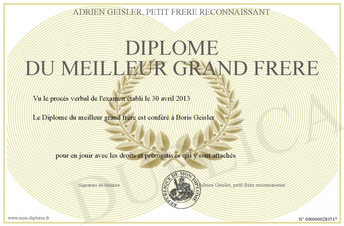 Envoyez par email votre Diplôme du meilleur grand frère personalisé