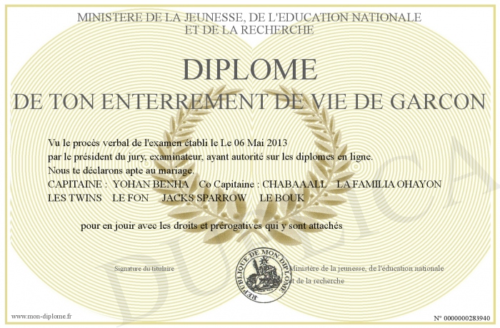 Envoyez par email votre Diplôme de TON ENTERREMENT DE VIE DE GARCON personalisé