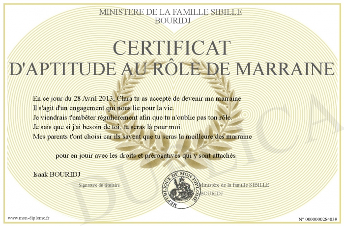 Envoyez par email votre CERTIFICAT D'APTITUDE AU RÔLE DE MARRAINE personalisé
