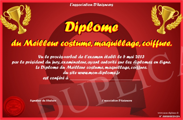 Envoyez par email votre Diplôme du Meilleur costume, maquillage, coiffure. personalisé