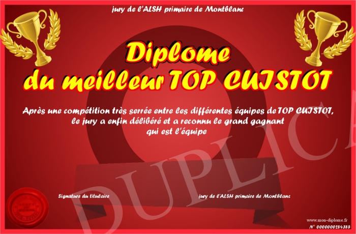 Envoyez par email votre Diplôme du meilleur TOP CUISTOT personalisé