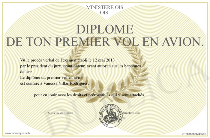 Envoyez par email votre Diplôme de ton premier vol en avion. personalisé