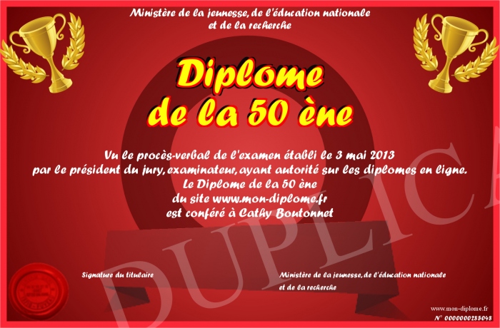 Envoyez par email votre Diplôme de la 50 ène personalisé