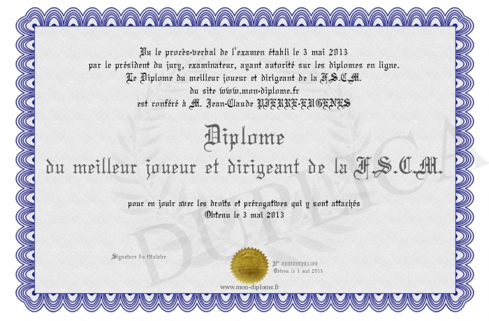 Envoyez par email votre Diplôme du meilleur joueur et dirigeant de la F.S.C.M. personalisé
