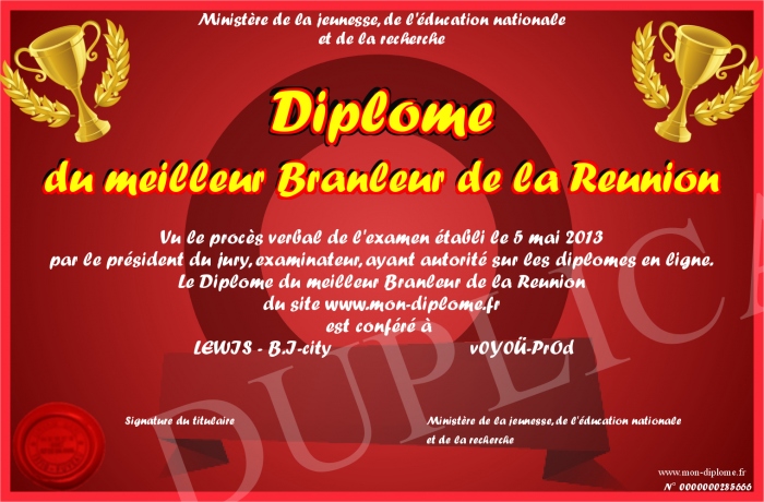 Envoyez par email votre Diplôme du meilleur Branleur de la Reunion personalisé
